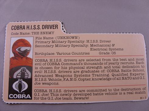 Cobra H.I.S.S. drivers are selected from the best and most evil of COBRA Commander's thousands of yearly recruits. Each is chosen for his physical strength and total dedication to evil! H.I.S.S. drivers are graduates of: COBRA Battle School, Advanced Weapons Systems Training. Qualified Experts: H.I.S.S. Vehicle, F.A.N.G. Copter, knowledge of all NATO and G.I. Joe weapons.