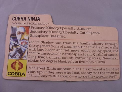 Code Name: STORM SHADOW Storm Shadow can trace his family history through thirty generations of assassins. He can scale sheer walls with bare hands and feet, move with blinding speed, and endure unspeakable hardship and pain. Qualified expert: Long bow, Samurai sword; Throwing stars; Nunchaku sticks; 8th degree black belt in five martial arts. "The great Ninja assassin clans disappeared a hundred years ago. If they were wiped out, nobody took the credit for it and if they're still around--who are they working for?"