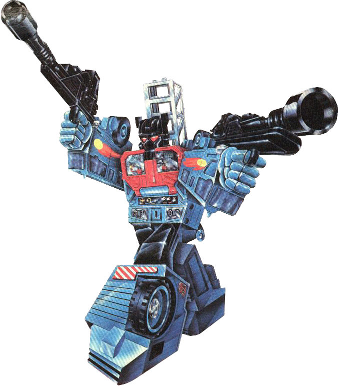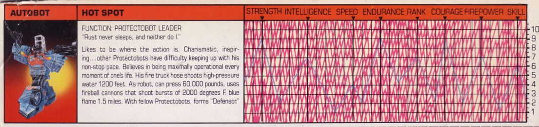 Likes to be where the action is.  Charismatic, inspiring...other Protectobots have difficulty keeping up with his non-stop pace.  Believes in being maximally operational every moment of one's life.  His fire hose shoots high-pressure water 1200 feet.  As robot, can press 60,000 pounds, uses fireball cannons that shoot burst of 2000 degrees F blue flame 1.5 miles.  With fellow Protectobots, forms "Defensor."