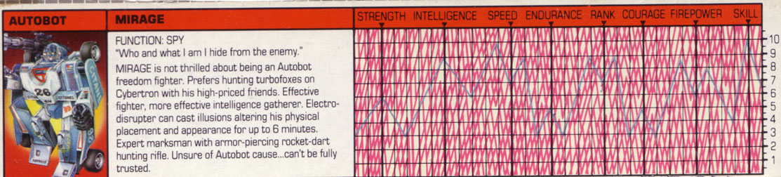 Profile: Mirage is not thrilled about being with a bunch of rough-and-tumble freedom fighters like the Autobots. If he had a choice he'd be in Monte Carlo, or better yet, back on his beloved Cybertron hunting turbofoxes with his high-priced friends. Autobot leader Optimus Prime must constantly cajole him into continuing his service with the Autobots, but he feels it may be a losing battle. Despite his coolness to the cause, Mirage is a surprisingly effective and deadly fighter and an even more effective intelligence gatherer, which is the role he much prefers.