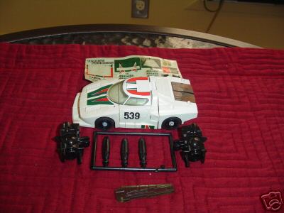 Wheeljack is the mad scientist of the Autobots.  Always inventing new weapons and gadgets.  Most adept at driving while in car mode.  Likes to show off his stunts.  Flying range of 800 miles using solid-fuel rockets in arms.  Shoots magnetic inducer, shrapnel-needle and gyro-inhibitor shells from his shoulder cannons.  He is his own worst enemy.  Often injured while experimenting with new weapons.