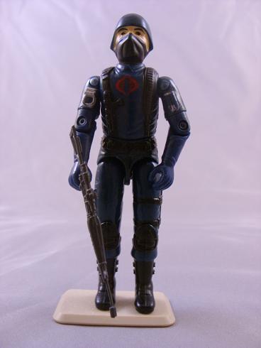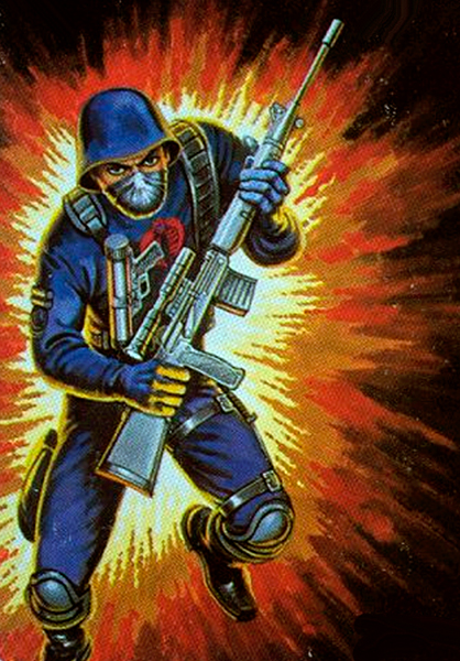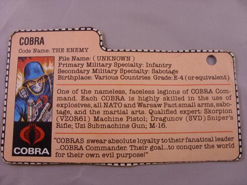 One of the nameless, faceless legions of COBRA Command. Each COBRA is highly skilled in the use of explosives, all NATO and Warsaw Pact small arms, sabotage, and the martial arts. Qualified expert: Skorpion (VZOR61) Machine Pistol; Dragunov (SVD) Sniper's Rifle; Uzi Submachine Gun; M-16.