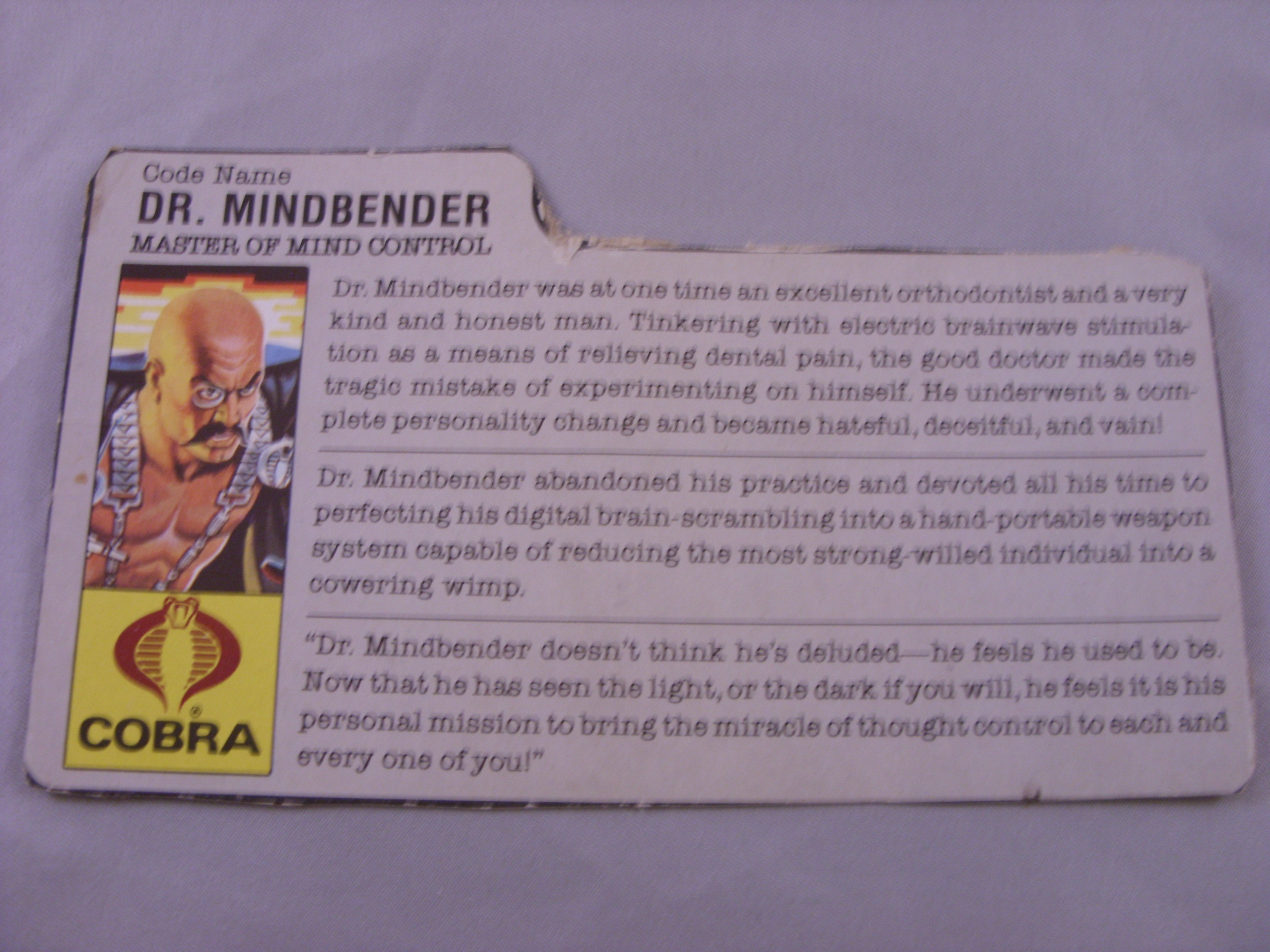 My Personal Notes: Really liked Dr Mindbender as a kid, mostly because one of the first Joe comics I read was when he was working to create Serpentor.  I thought that was really cool, and I then had to go back and find the back issues.  Anyway, he was the cool standby guy that I always had as my right-hand mad scientist for whomever was leading Cobra at my playtime.  I have kept him complete with his handgun, a silver prod, a black power generator, a black cape (with a painted silver Cobra logo), and a black hose.