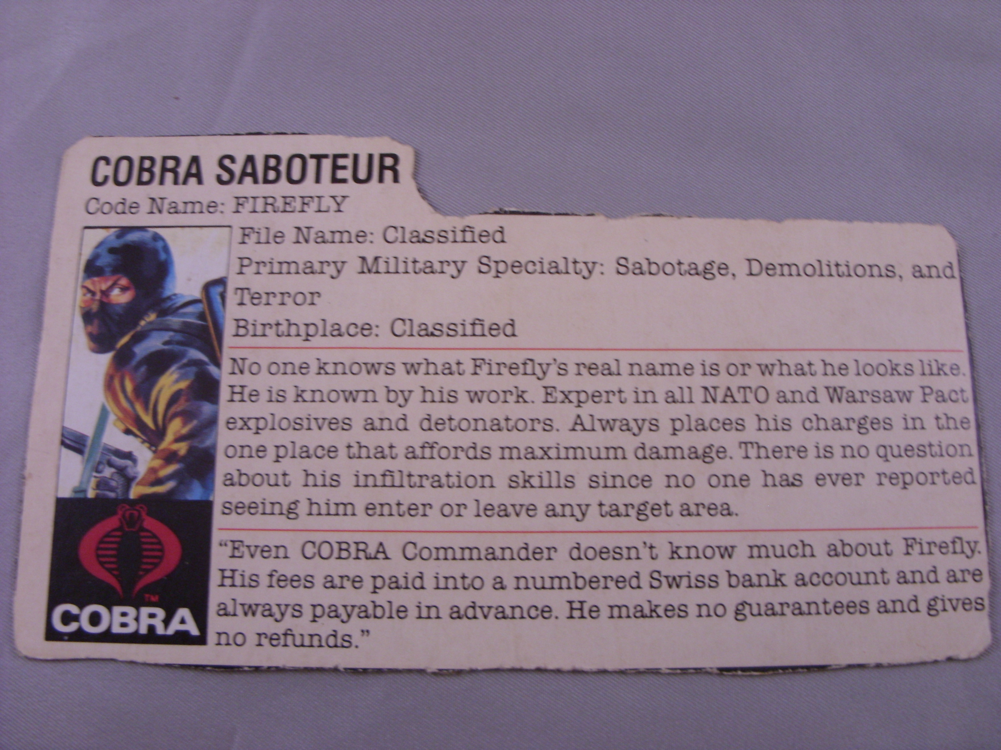 "Even COBRA Commander doesn't know much about Firefly. His fees are paid into a numbered Swiss bank account and are always payable in advance. He makes no guarantees and gives no refunds."