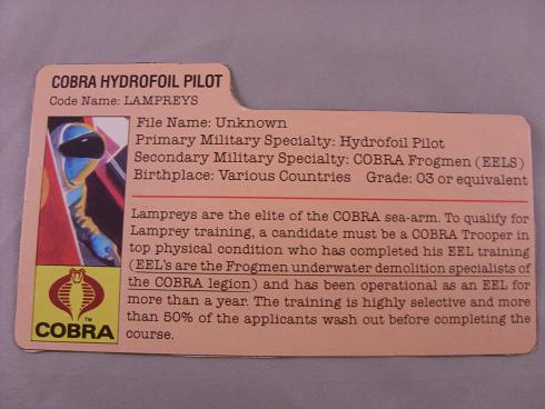 Code Name: LAMPREYS Lampreys are the elite of the COBRA sea-arm. To qualify for Lamprey training, a candidate must be a COBRA Trooper in top physical condition who has completed his EEL training (EEL's are the Frogmen underwater demolition specialist of the COBRA legion) and has been operational as an EEL for more than a year. The training is highly selective and more than 50% of the applicants wash out before completing the course. |