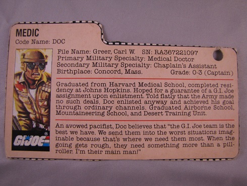 Code Name: DOC Graduated from Harvard Medical School, completed residency at Johns Hopkins. Hoped for a guarantee of a G.I. Joe assignment upon establishment. Told flatly that the Army made no such deals. Doc enlisted anyway and achieved his goal through ordinary channels. Graduated Airborne School, Mountaineering School, and Desert Training Unit. An avowed pacifist, Doc believes that "the G.I. Joe team is the best we have. We send them into the worst situations imaginable because that's where we need them most. When the going gets rough, they need something more than a pill roller. I'm their man!"