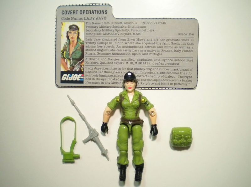 Code Name: LADY JAYE Lady Jaye graduated from Bryn Mawr and did her graduate work at Trinity College in Dublin where she acquired the faint Gaelic lilt that adorns her speech. An accomplished actress and mime as well as a studied linguist, she can easily pass as a native in France, Italy, Poland, Russia, Germany, Afghanistan, Spain, and Portugal. Airborne and Ranger qualified, graduated intelligence school Fort Holabird. Qualified expert: M-16, M1911A1 and reflex crossbow. "Lady Jaye doesn't go in that phoney wig and rubber mask brand of disguise like those jokers on Mission Improbably.. She becomes the subject: body language, subtle gesture, correct shading of dialect--The right look in the eye. Cloaked and sandaled, she can squat down with a basket of oranges in any Middle Eastern marketplace and blend in perfectly."
