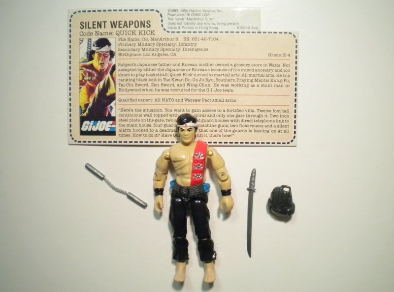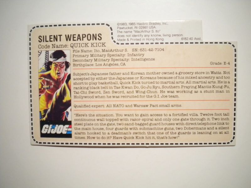 Code Name: QUICK KICK Subject's Japanese father and Korean mother owned a grocery store in Watts. Not accepted by either the Japanese or Koreans because of his mixed ancestry and too short to play basketball, Quick Kick turned to martial arts. All martial arts. He is a ranking black belt in Tae Kwan Do, Go Ju Ryu, Southern Praying Mantis Kung-Fu, Tai-Chi Sword, Zen Sword, and Wing-Chun. He was working as a stunt man in Hollywood when he was recruited for the G.I. Joe team. Qualified expert: All NATO and Warsaw Pact small arms. "Here's the situation. You want to gain access to a fortified villa. Twelve foot tall continuous wall topped with razor-spiral and only one gate through it. Two inch steel plate on the gate, two sand-bagged guard houses with direct telephone link to the main house, four guards with submachine guns, two Dobermans and a silent alarm hooked to a deadman's switch that one of the guards is leaning on at all times. How to do it? Have Quick Kick hit it, thats how!"