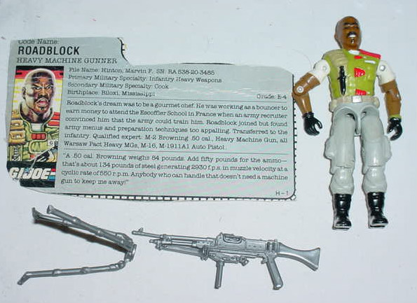 Roadblock's dream was to be a gourmet chef. He was working as a bouncer to earn money to attend the Escoffler School in France when an army recruiter convinced him that the army could train him. Roadblock joined but found army menus and preparation techniques too appalling. Transferred to the infantry. Qualified expert: M-2 Browning .50 cal.; Heavy Machine Gun; all Warsaw Pact Heavy MGs; M-16; M-1911A1 Auto Pistol.