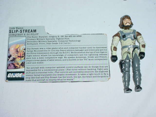 Slip Stream was a video-game whiz and computer hacker until he discovered flying. He joined the Jr. Civil Air Patrol while a teenager and eventually got his Air Force commission through the R.O.T.C. He finished at the top of his class in flight school where his knowledge of computers and his lightning reflexes gave him a keen competitive edge. He speaks Armenian, Greek and French, plays a mean game of table tennis, and is known in the "Pit" as an unrepentent joker and mimic.