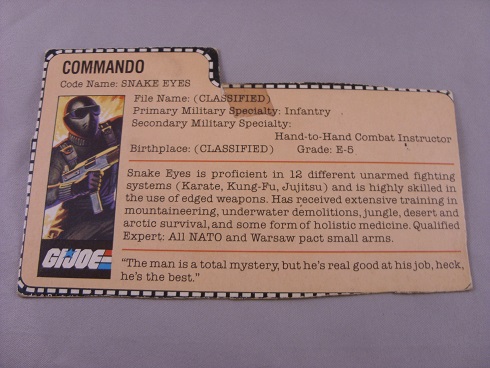 Snake Eyes is proficient in 12 different unarmed fighting systems (Karate, Kung-Fu, Jujitsu) and is highly skilled in the use of edged weapons. Has received extensive training in mountaineering, underwater demolitions, jungle, desert and arctic survival, and some form of holistic medicine. Qualified Expert: All NATO and Warsaw pact small arms.